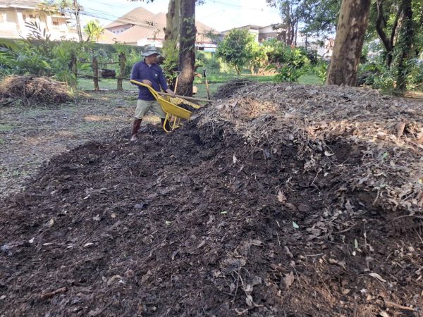 โรยใบไม้ป่าหมักบดละเอียด 1–2 กิโลกรัมต่อตารางเมตร