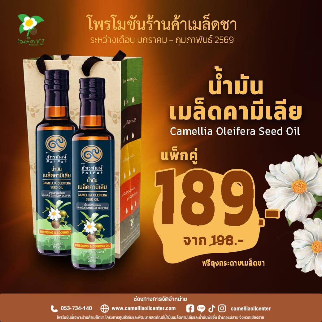 เลือกน้ำมันเมล็ดคามีเลีย คุณภาพพรีเมียม จากมาตรฐานการผลิตของ โครงการศูนย์วิจัยและพัฒนาผลิตภัณฑ์น้ำมันเมล็ดคามีเลียและน้ำมันพืชอื่น มูลนิธิชัยพัฒนา เพื่อสุขภาพที่ดีของคุณและครอบครัว สั่งซื้อวันนี้!